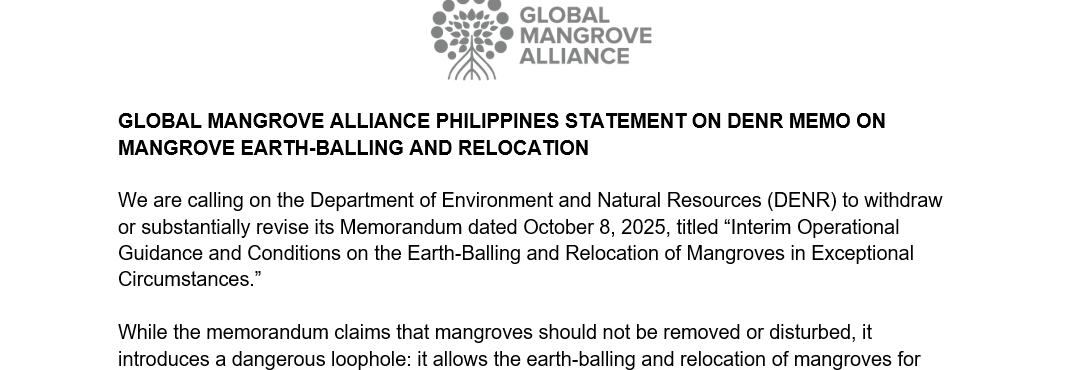 We, members of the Global Mangrove Alliance Philippines, urge the Department of Environment and Natural Resources (DENR) to withdraw or substantially revise its Memorandum dated October 8, 2025, titled “Interim Operational Guidance and Conditions on the Earth-Balling and Relocation of Mangroves in Exceptional Circumstances.”